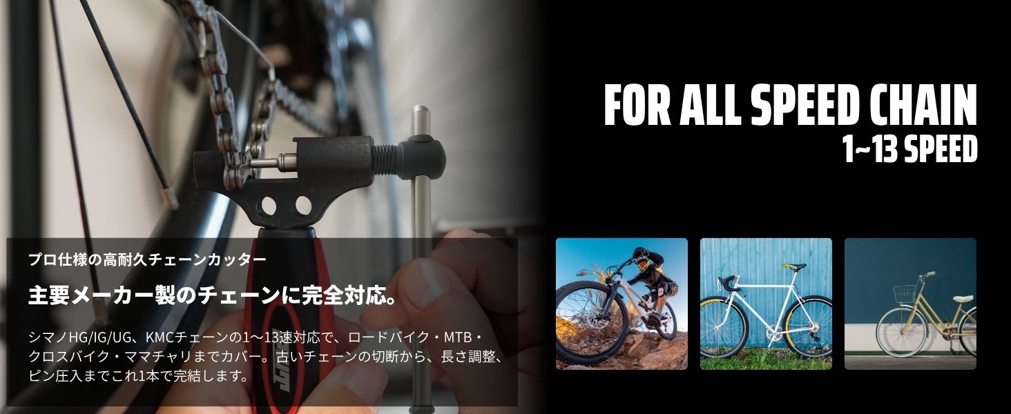 1速から13速までのチェーンに対応しており、シマノHG・IG・UGやKMCチェーンに対応、ロードバイク、MTB、ママチャリなど幅広い互換性があります。