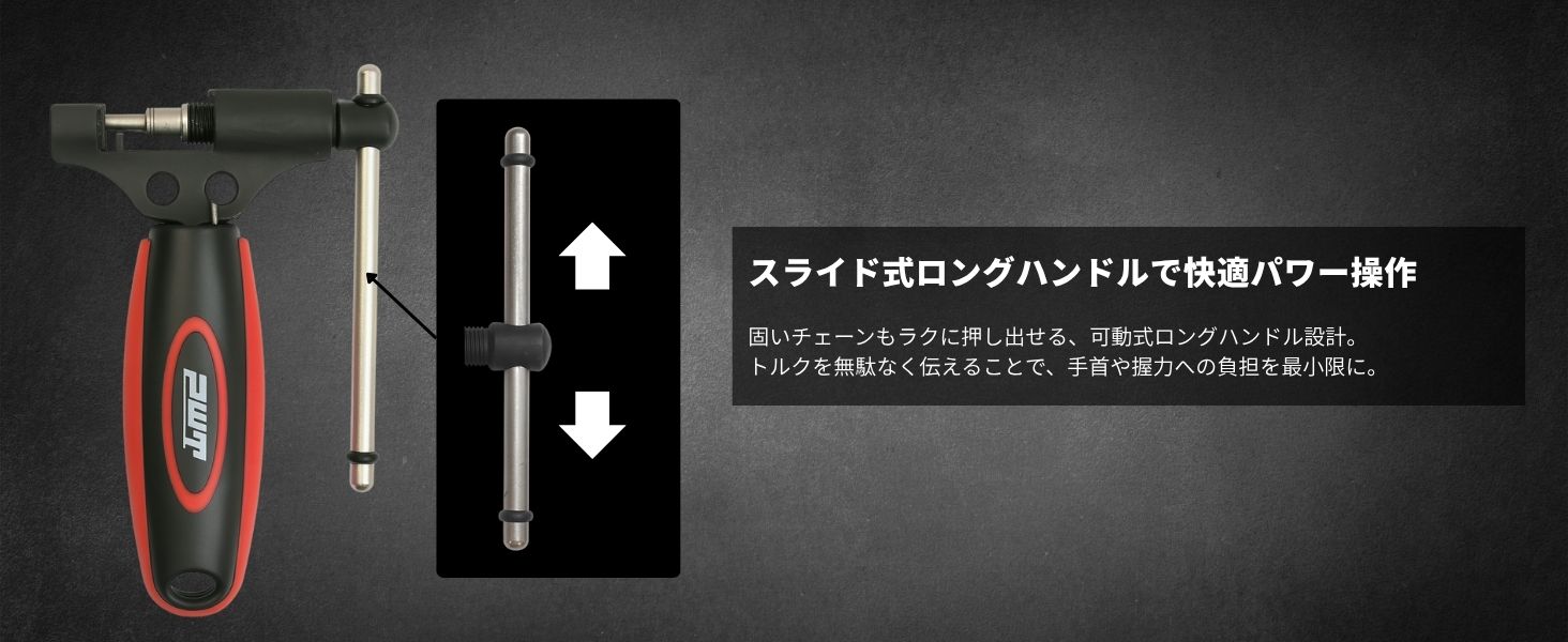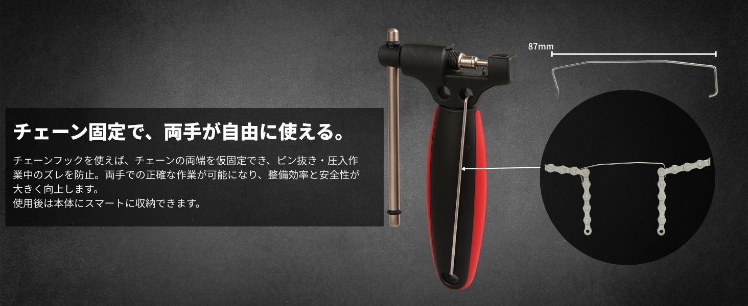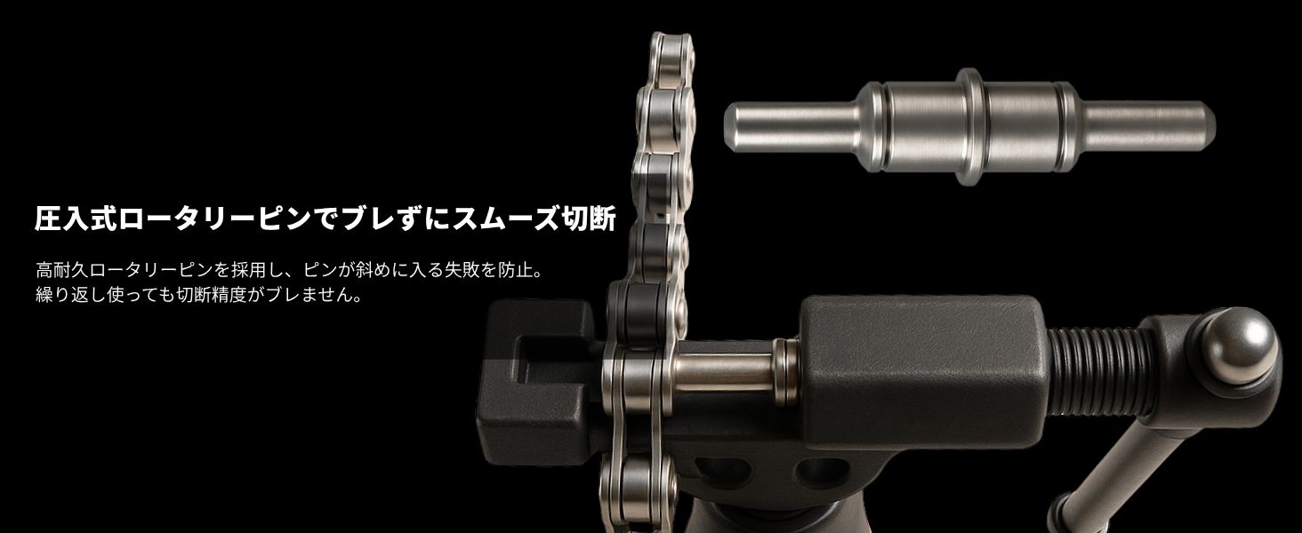 チェーンの取り外し、チェーンのカットやピン圧入まで、これ1本で作業が可能。