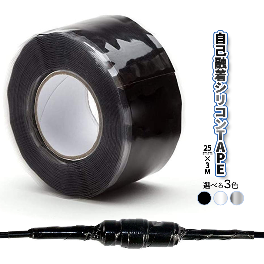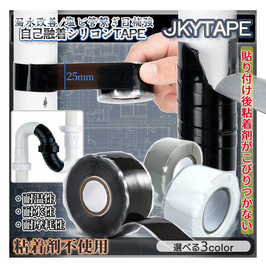 防水テープ シリコンテープ 自己融着 幅25mm 全長3m 選べる3色 黒 グレー 白 配管 漏れ対策 絶縁 配管補修 漏水 修繕 パイプ 浴槽 水道 台所 DIY JKYTAPE